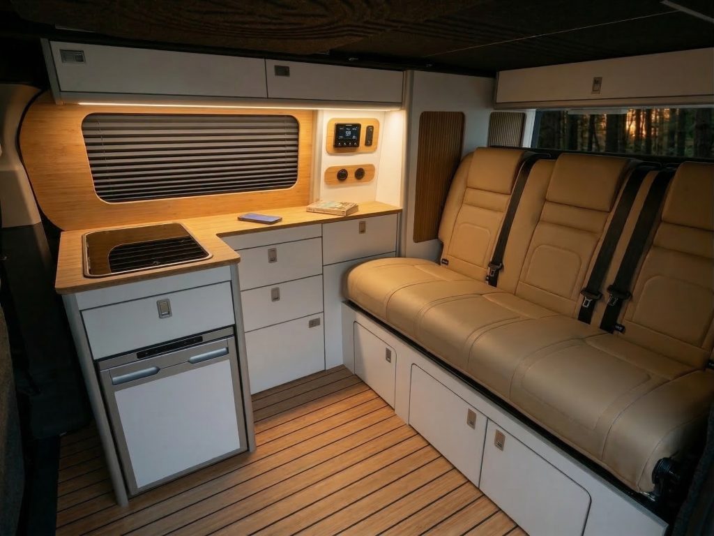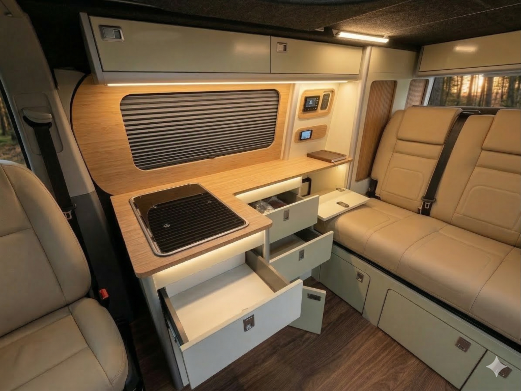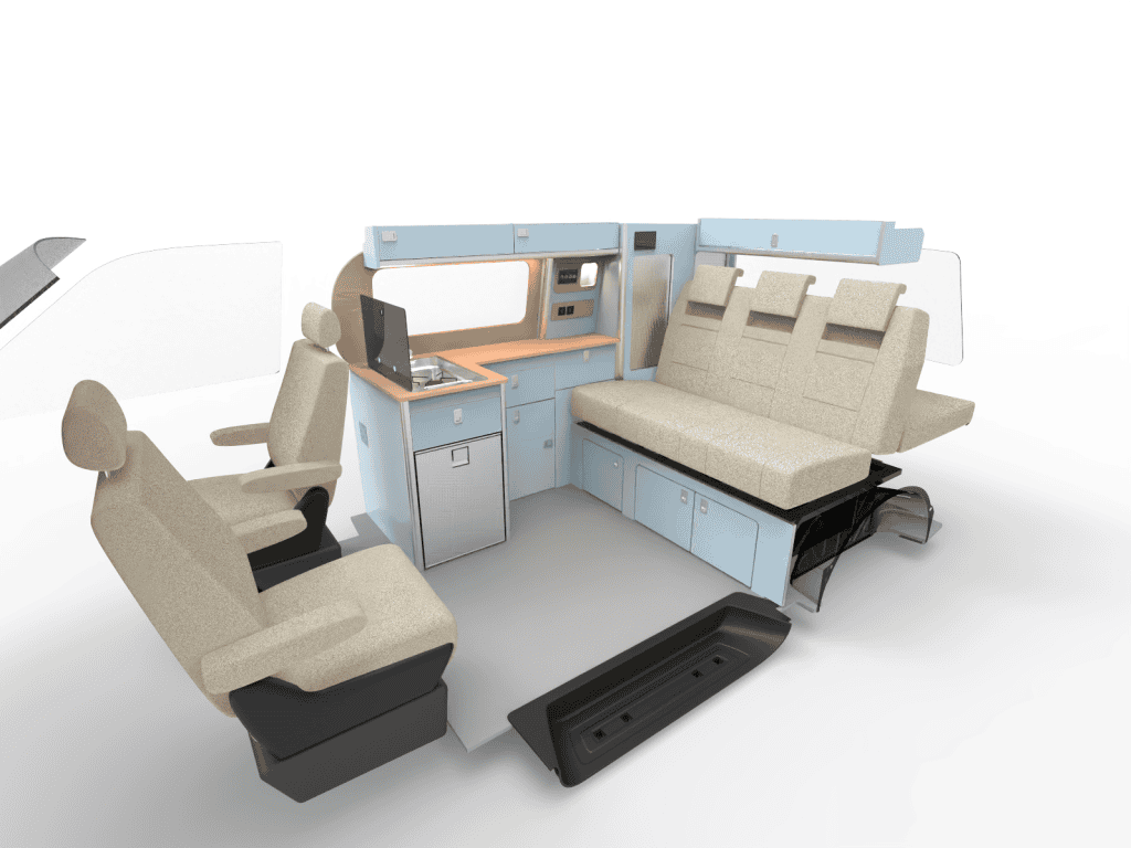 Smart design meets everyday practicality. Our flat-pack campervan furniture is crafted to fit your van perfectly, with appliances and accessories to enhance comfort, functionality, and style.